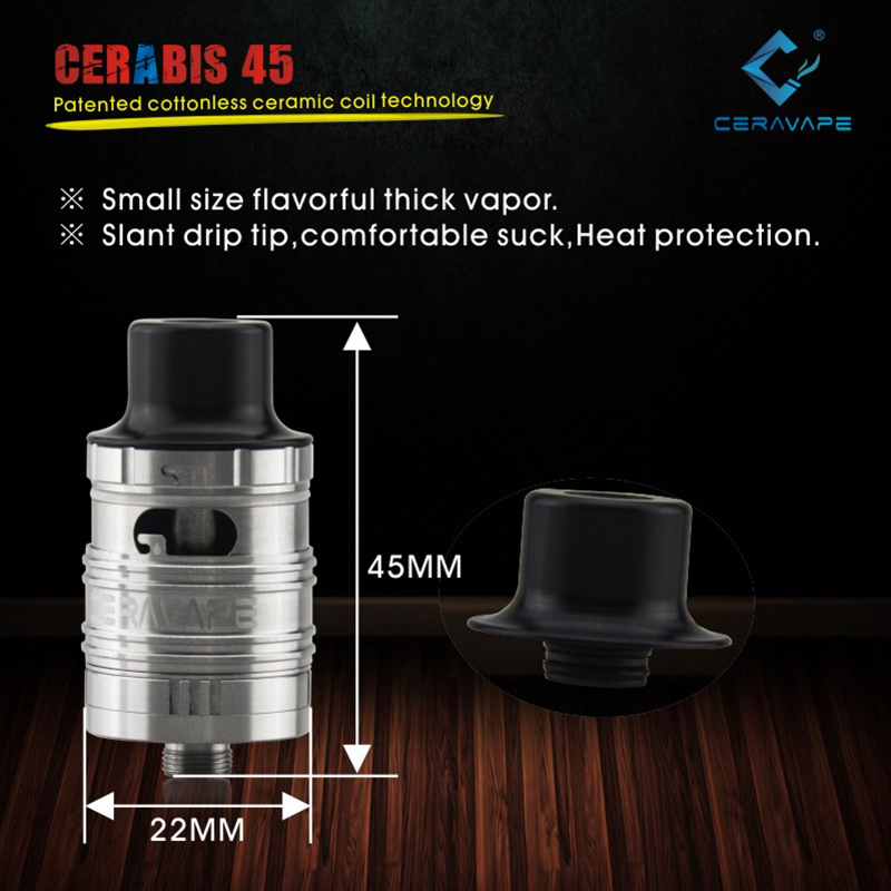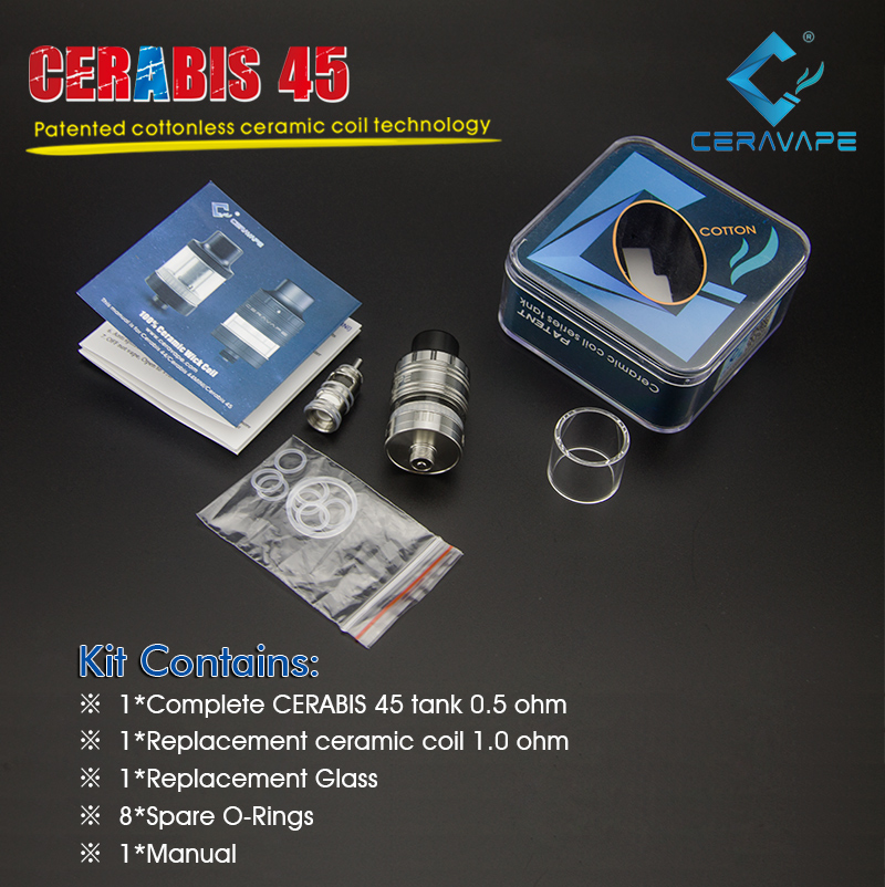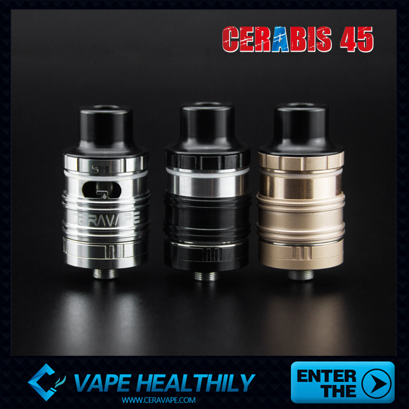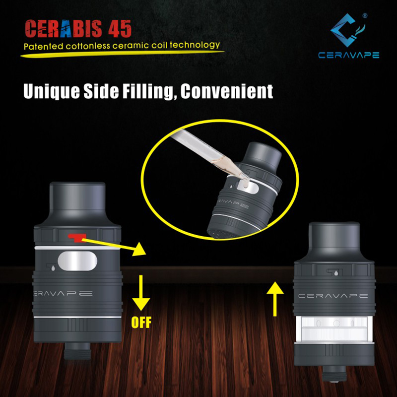 Ceravape has engineered the new Cerabis 45 tank containing a vertical ceramic coil and SIDE FILL method with an e-liquid capacity of 2.5ml.